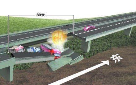 但也有人質(zhì)疑為什么現(xiàn)場會有一座橋墩斷裂,而不僅僅是“橋面垮塌”。橋墩斷裂的原因可能是如下兩種:1,爆炸點正好在墩頂,橋墩被沖擊荷載破壞;2, 爆炸點雖然不在墩頂,但墩頂有固定支座,沖擊荷載的作用通過連續(xù)梁作用于墩頂,將橋墩推倒。